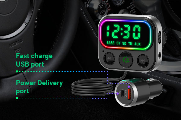 The device has been separated into 2 parts for greater convenience of use. The charger is connected to the cigarette lighter socket, while the functional display can be connected to the air vent or, with the help of an additional stand, attached to the car's dashboard.